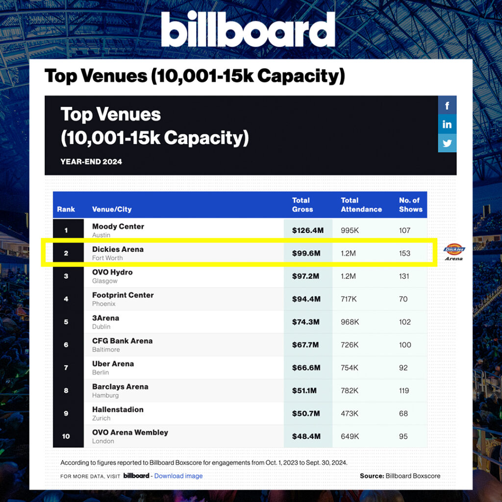 Billboard Magazine’s 2024 Top 10 Worldwide boxscore charts reveals Dickies Arena ranking #2 among all venues in the world with a seating capacity of 10,001-15,000 from October 1, 2023 to September 30, 2024. To view the Billboard Magazine Top 10 chart, please click here.