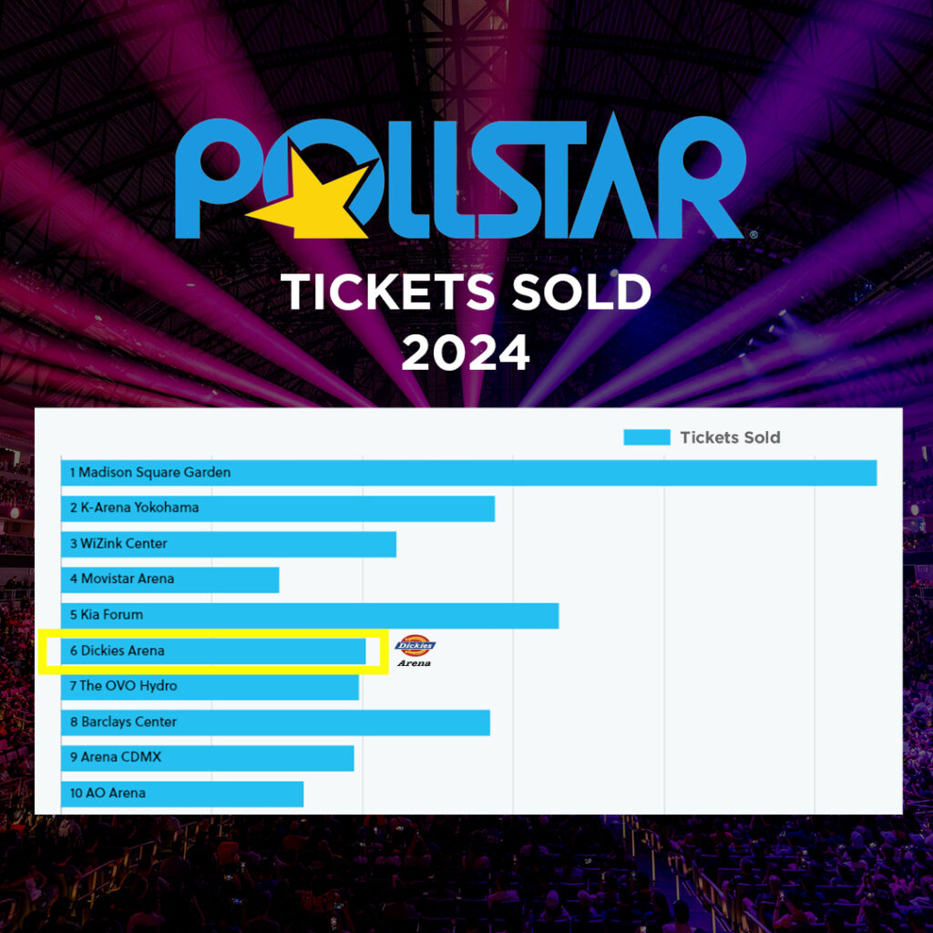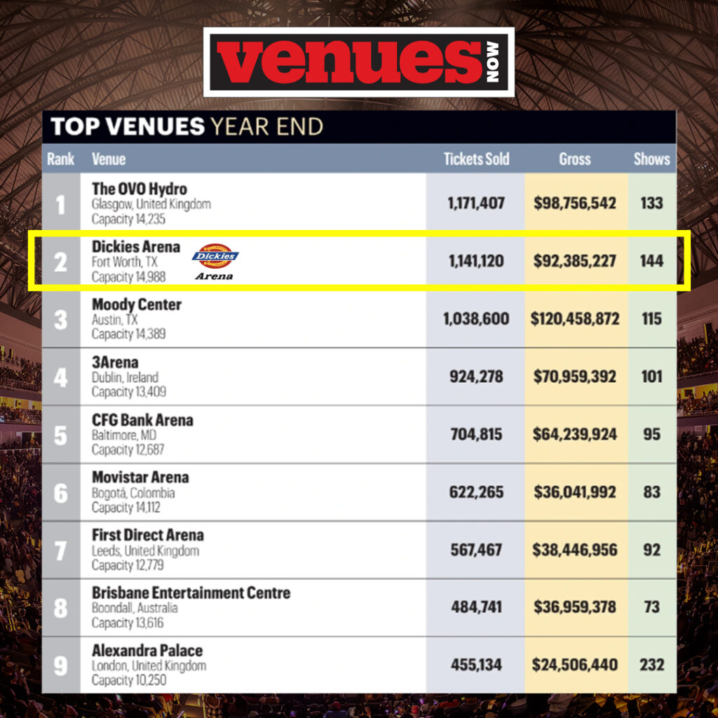 Dickies Arena would like to share this incredible achievement with the fans because it is the fans and their support that catapulted Dickies Arena onto the Worldwide stage. Stay tuned as 2025 will continue to include amazing artists, bands and shows for all entertainment goers.