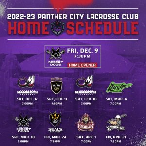 The Panther City Lacrosse Club, in conjunction with the National Lacrosse League, announced the schedule for the team’s 2022-23 season today. Panther City will begin it’s second season of play with a home game against the Las Vegas Desert Dogs in Fort Worth at Dickies Arena on Friday, December 9, at 7:30 p.m. Home Schedule below: