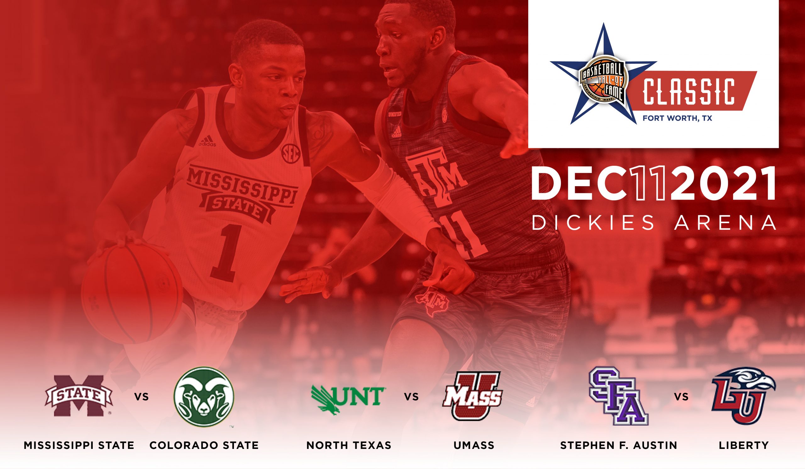 The Naismith Memorial Basketball Hall of Fame announced the field of teams for the first-ever Basketball Hall of Fame Classic to be held at Dickies Arena on Saturday, December 11, 2021. The one-day triple-header will feature Mississippi State vs. Colorado State, North Texas vs. UMass, and Stephen F. Austin vs. Liberty.