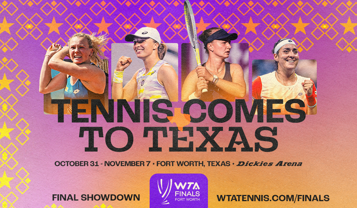 Fort Worth will host the prestigious year-end finale, featuring the top 8 singles players and doubles teams in the Race to the WTA Finals Fort Worth, October 31 through November 7th at Dickies Arena!