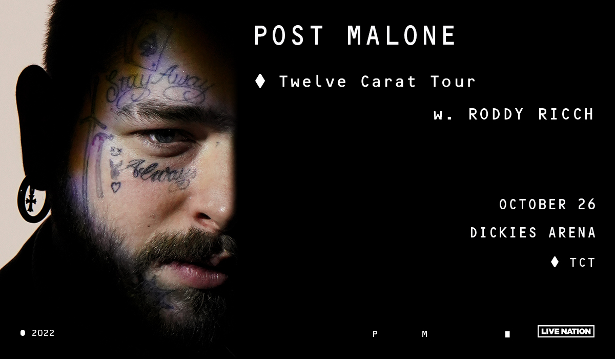 Post Malone’s Twelve Carat Tour is coming to Dickies Arena on Wednesday, October 26th with guest Roddy Ricch.