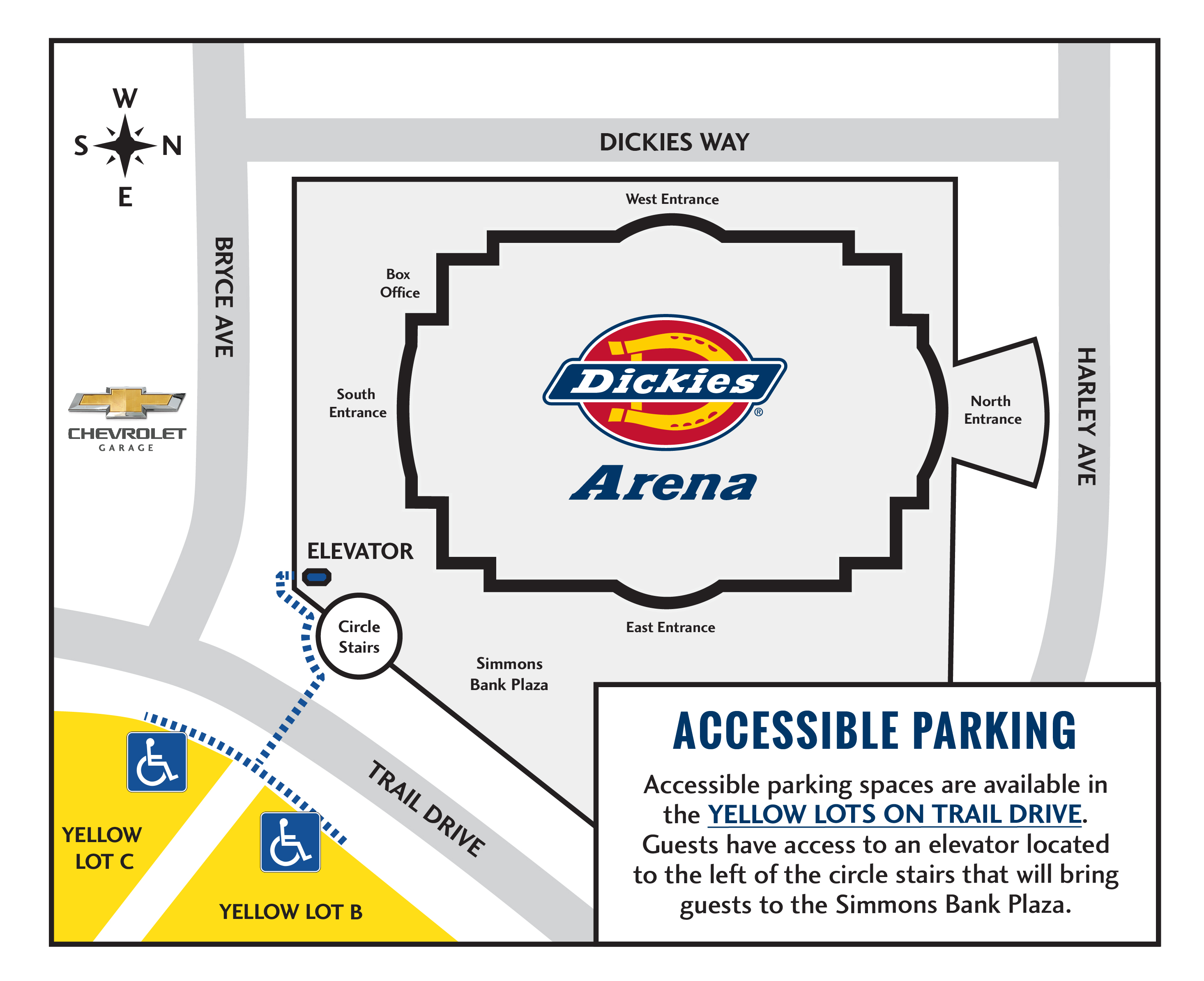 East Entrance: The northeast corner of the Simmons Bank Plaza has an elevator to assist guests with disabilities coming from the Will Rogers Complex. Guests parking in accessible spaces in the yellow lots have access to an elevator outside the southeast corner of the arena that will bring guests to the Simmons Bank Plaza.