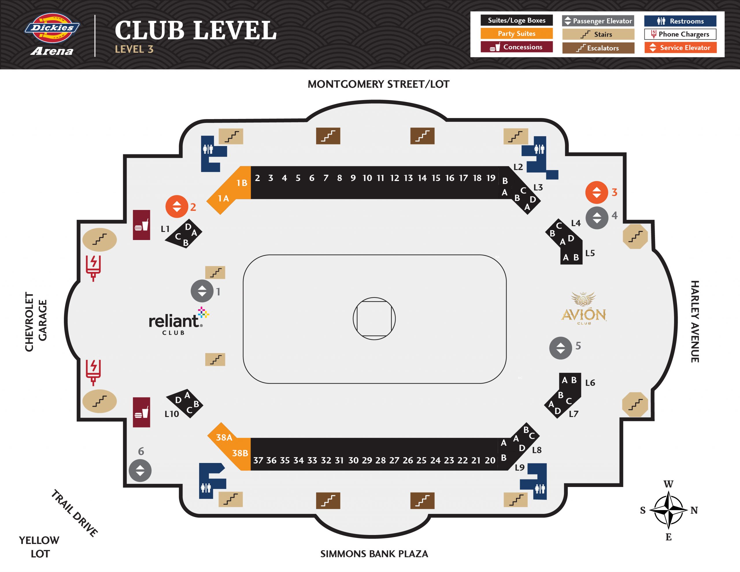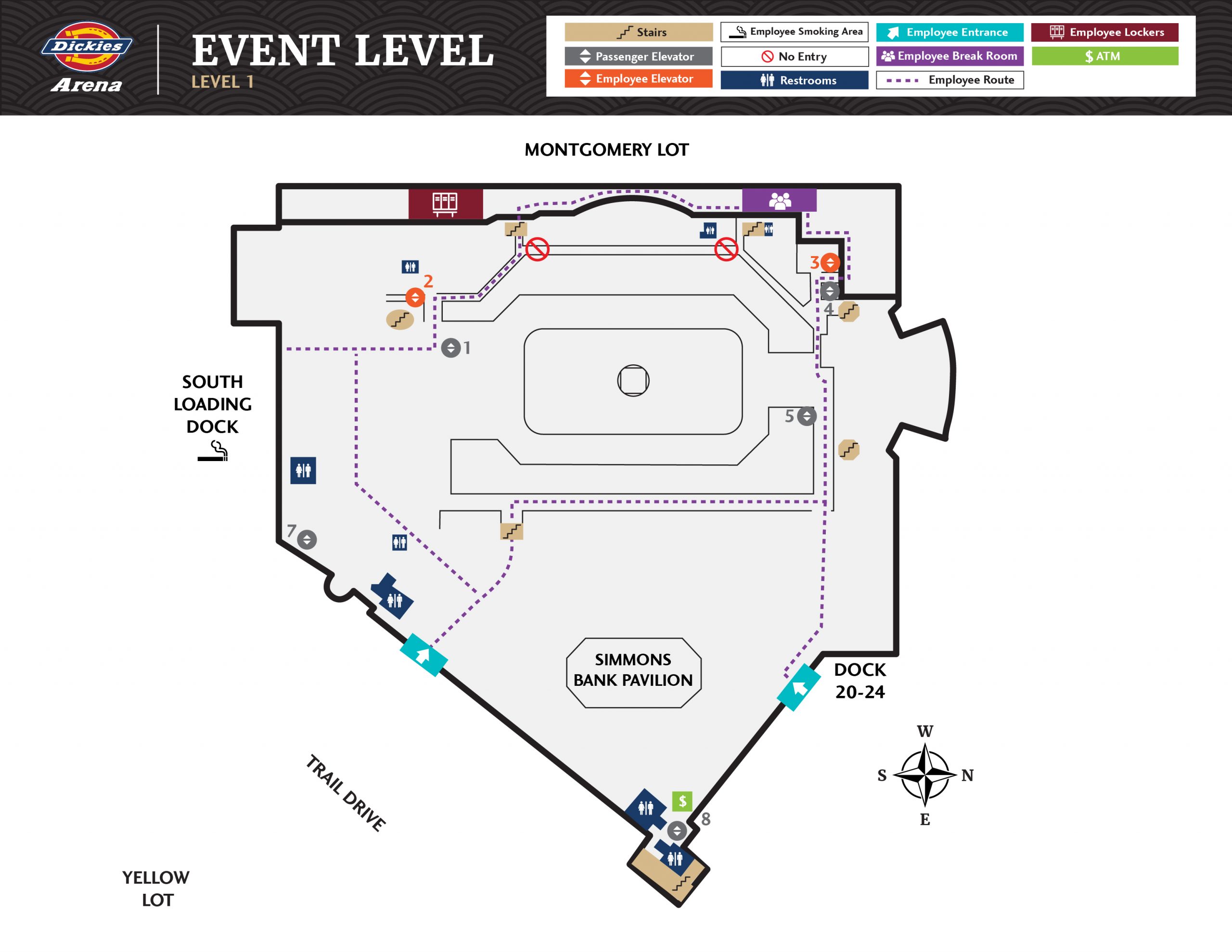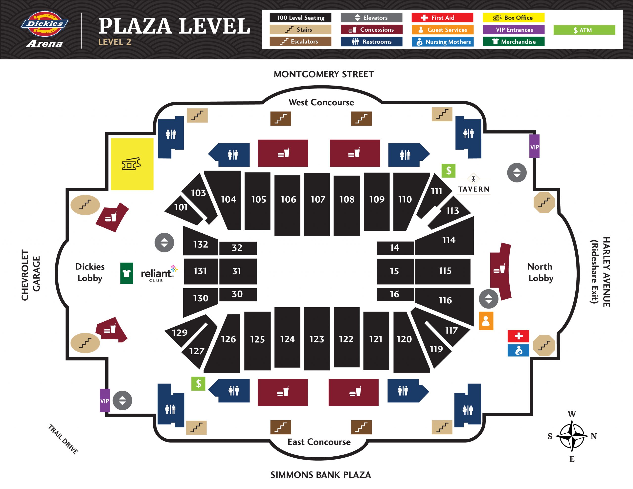 Regular guest restrooms and family restrooms can be found on every level of the arena. All restrooms at Dickies Arena are ADA accessible.