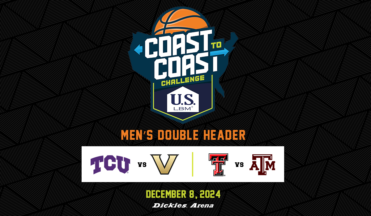 TCU and Vanderbilt will begin the doubleheader at 11:30 a.m. CT on ESPN U and Texas A&M and Texas Tech will follow at 2 p.m. CT on ESPN 2. The event precedes another basketball game with the TCU women’s team facing defending national champion South Carolina at 6 p.m. in the USLBM Coast to Coast Challenge featuring the Hoopfest Women’s Basketball Classic.