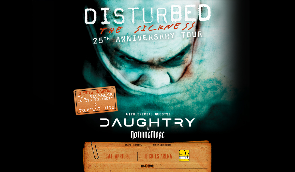 97.1 The Eagle Presents Disturbed: The Sickness 25th Anniversary Tour at Dickies Arena Saturday, April 26th, 2025 with special guests Daughtry and NOTHING MORE.