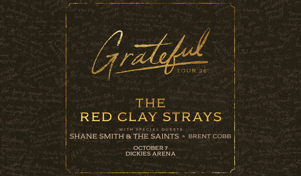 The Red Clay Strays are bringing their Grateful Tour 2026 with special guests Shane Smith & The Saints and Brent Cobb to Dickies Arena on Wednesday, October 7, 2026.