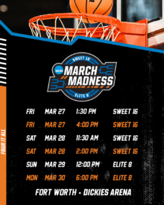 Be a part of the March Madness women’s basketball tournament! This is the fourth year of the updated format where you can now watch 8 teams battle it out in the Sweet Sixteen and Elite Eight rounds and witness two teams advance to the 2026 Women’s Final Four! The action takes place at Dickies Arena March 27-30, 2026. Tickets for the Fort Worth Regional will be going on sale in the fall and you can be part of the exclusive presale by signing up today!