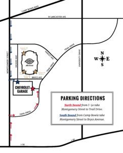 To Arrive at the Chevrolet Garage From East Fort Worth and Dallas: Take I-30 West toward Fort Worth. Exit on to the Chisholm Trail Parkway and take the University Street exit, which is free. Turn right onto University Street, and then turn left at Trail Drive to access the Chevrolet Garage, located on the right. Present your parking hang tag or pass to parking team members to access the garage.